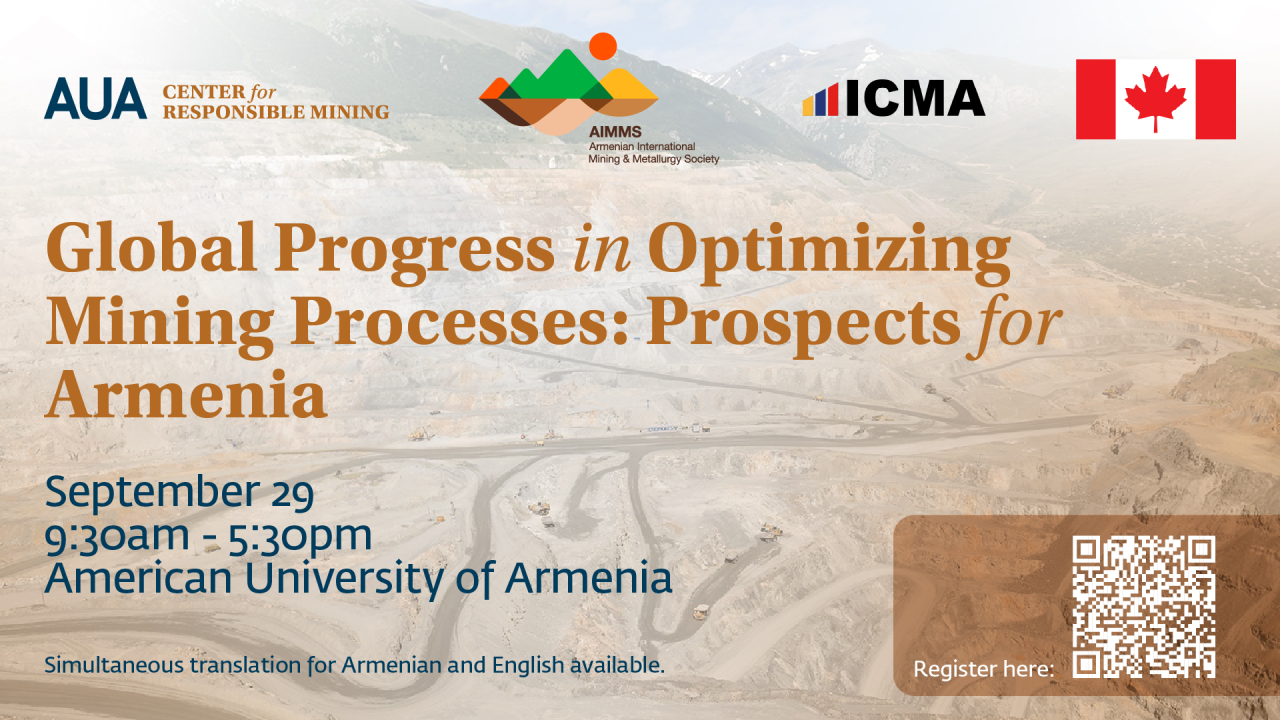 Alex and Marie Manoogial Hall 40 Baghramyan Avenue, YerevanThe American University of Armenia (AUA) Center for Responsible Mining, the Armenian International Mining & Metallurgical Society (AIMMS), and the International Chamber of Mines of Armenia (ICMA) present Global Progress in Optimizing Mining Processes: Prospects for Armenia, taking place on September 29, 2025, at AUA in Yerevan, Armenia. The workshop will feature a series of …